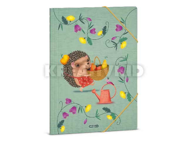 A/4 méretű gumis dosszié iratok, füzetek tárolására. 350 gr-os vastag kartonból készült dosszié lekerekített első sarkokkal, színes gumi zárópánttal. Külseje négy színnel, fényes fóliával nyomott. Belső oldala nyomatlan.