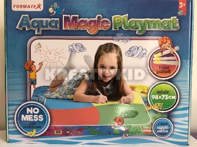 Az Aqua Magic rajzszőnyeg elvarázsol minden kicsit. A szőnyegre a különleges tollal lehet rajzolni, aminek van egy tartálya, amit vízzel kell megtölteni, majd azzal a szőnyegre rajzolni. A szőnyeg színe megváltozik, így jelenik meg a rajz. Amint a víz megszárad, a rajz eltűnik és újra indulhat a móka. A szőnyeg piros, sárga, kék és zöld alapú. A csomagolás tartalmazza a tollat is.