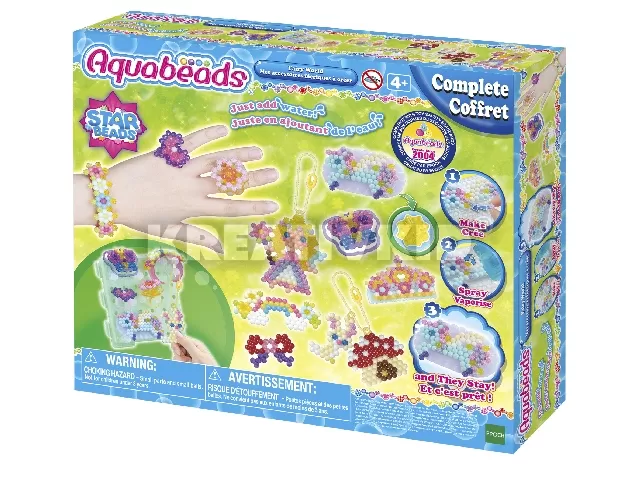 A csomagban található csillaggyöngyökből megannyi csodás és színpompás kiegészítő megalkotható. Mindemellett található a dobozban permetező, alátét, formák és használati utasítás. Az AquaBeads egy különleges, japán tervezésű kézügyesség fejlesztő és szórakoztató kreatív játék. A gyöngyök és egy kis víz segítségével csodálatos 2D-s és 3 D-s képek készíthetők: állatok, díszek, ékszerek… vagy bármi, amit a kreativitásod és fantáziád enged. Az AquaBeads gyöngyök víz hatására összetapadnak, száradás után pedig egyben maradnak.