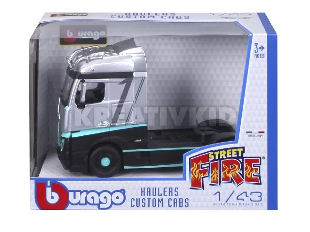 Ez a nyerges vontató az utak királya. Meredes márkájú, gyönyörű ezüst színben, amelyet türkiz csíkok törnek meg így a klasszikus megjelenés dinamikussá, fiatalossá válik. 1:43-as arányban másolja le az eredeti paramétereket, figyelve az apró részletekre is. A gyerekek imádják a nagy járműveket, ezzel a kamionnal könnyű örömet szerezni.
