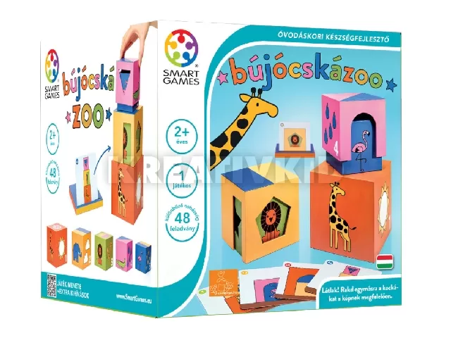 Az állatkerti állatok szeretnek bújócskázni, kukucskálni! Ki tudod kémlelni, hogy ezek a vidám állatok hol rejtőznek? Válassz egy feladványt, és próbáld meg egymásra rakni a kockákat a kártyán látható módon.