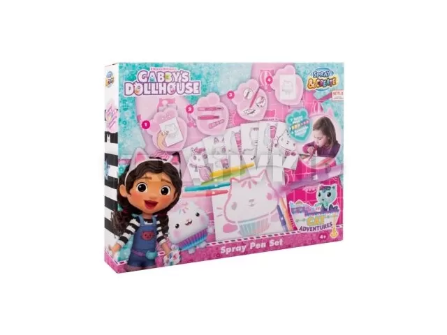 Canenco: Gabi babaháza kifestő filc festékszórókkal. A doboz 6 darab stencilt és 7 különböző színű, festékszóróként használható fújós filctollat tartalmaz.
