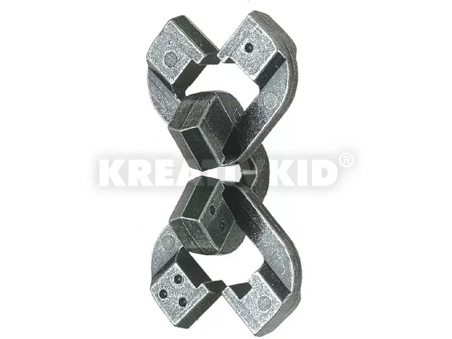 Három acéldarab kapaszkodik egymásba, mint a láncszemek. Bár három módja is van ennek, attól függően, melyik szem van éppen középen, csak látszatra egyszerű őket szétszedni! Japánból származó ötlet alapján egy holland mester készítette el ezt az ördöglakatot – kizárólag haladóknak ajánlott!
