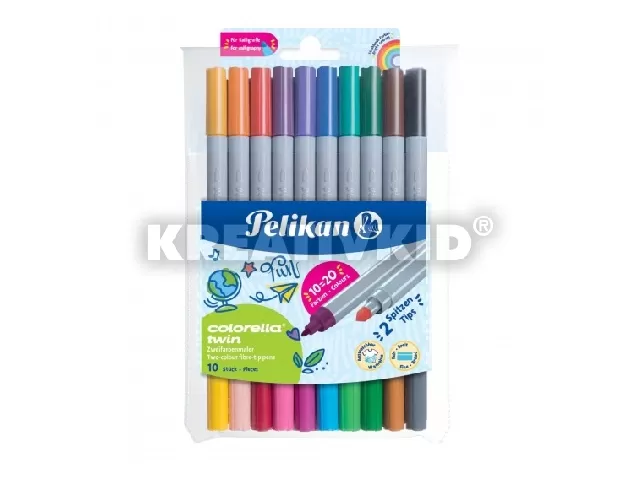 Kiváló minőségű filctoll, 10 toll 20 színnel, 2 írásvastagság, a sötét színek hegyének átmérője kb 1 mm (körvonalakhoz és vázlatokhoz), a világos színek hegyének átmérője kb. 2 mm (színezéshez), vízbázisú, a legtöbb textilből kimosható, kupakján légrésekkel, CE jelöléssel