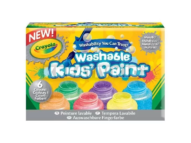 A Crayola 2014-es őszi újdonságai között találhatjuk a metál csillogású festékkészletet is. Készíts lélegzetelállító alkotásokat, vagy ékesítsd tárgyaidat a különleges színvilágú festékekkel. Az egészségre ártalmatlan, minőségi Crayola festékek a szövetekből, a lemosható felületekről, valamint a bőrről is letisztíthatóak.