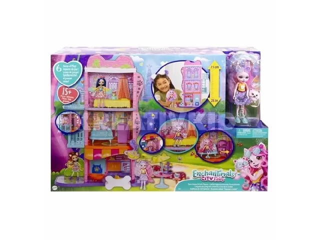 Az Enchantimals a barátságról, az állatok és a természet szeretetéről és a gondoskodásról szól, erre tanítja a kicsiket is. A jóbarátok a városban is odafigyelnek egymásra nem csak a természetben. Palmer Pomeranian baba és barátja Pommy egy imádnivaló, 70 cm-nél is magasabb 3 szintes toronyházban lakik. A ház 6 játéktere végtelen történeteket inspirál. A földszinten kávézó és kerthelyiség, az elsőn konyha és nappali egy nyitható hűtővel, a másodikon egy hálószoba, a tetőtéren egy kis medence, továbbá két erkély, egy tűzlépcső és sok minden más várja Palmer és (külön kapható) barátai szórakozását, akiket vendégségbe invitál. A számos kiegészítővel fantasztikus városik kalandok játszhatók el. Az Enchantimals karakterek között lévő kötelék tényleg varázslatos, az egymásra figyelés és törődés közben igazán változatos és vidám történeteket játszhatnak el a gyerekek. A színek és díszítések eltérhetnek. Enchantimals: Mindenünk a gondoskodás!