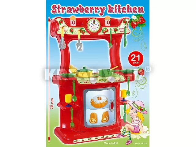 Készítsd el a legfinomabb sütiket az epres konyhán! Az Epres konyha műanyagból készült, piros színű és eperszemekkel van díszítve! A konyhán bármilyen ételt el tudsz készíteni, megtanulhatod, hogyan kell főzni és süteményeket sütni! A csomagban 21 kiegészítőt, lábosokat, edényeket, lapátokat és szedőeszközöket is megtalálsz, ezekkel megtapasztalhatod, mit hogyan kell használni. A sütő ajtaja nyitható, a szerszámokat kampókra tudod felakasztani. Epres konyha magassága: 76 cm.