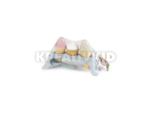 A készletben 2 darab fagyi (tölcsér és homokozóforma), egy fagyis kanál és egy muffin található.