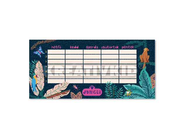 Kétoldalas, magyar nyelvű órarend A és B hét beosztással. 250 gr-os félfényes műnyomó papírra, 4 szín nyomással nyomott.