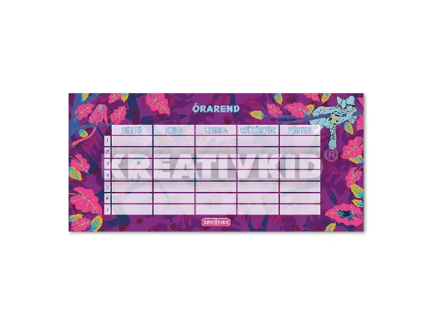 Kétoldalas, magyar nyelvű órarend A és B hét beosztással. 250 gr-os félfényes műnyomó papírra, 4 szín nyomással nyomott.