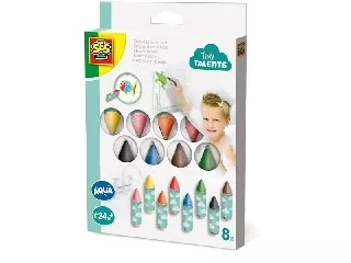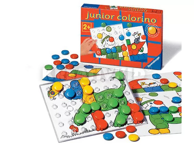 Rakj ki egy képet színes korongokból. A dobozban találsz egy „lyukacsos” táblát, rajzos sablonokat, és sok színes korongot. Tedd a rajzot a tábla mögé, és próbáld elhelyezni a megfelelő színű korongokat, mintha lapra színeznél. Ha sikerült, elveheted a sablont, és máris kész a kép. A korongok méretben és színben (4 alapszín) is igazodik a legkisebbekhez.