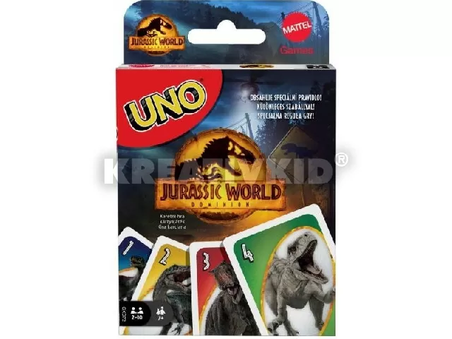 Vajon az őskorban melyik lett volna a legnépszerűbb kártyajáték? Biztos, hogy az UNO Jurassic World változata. Ez az, ahol az UNO izgalmas világa a legvadabb dinoszauruszokkal találkozik. Ebben a speciális kártyajátékban, az alap UNO-hoz hasonlóan az a játékosok célja, hogy minél hamarabb megszabaduljanak az összes kártyájuktól. A speciális kártyák azonban még nagyobb izgalmakat hoznak a játékba. A játszmák győztese az ellenfelek kezében maradt lapok után is pontokat kap. Az a végső győztes, aki eléri az 500 pontot. Persze a legfontosabb szabály változatlan: Ha már csak egy kártya van a kezedbe, ne felejtsd el azt kiáltani: UNO!
