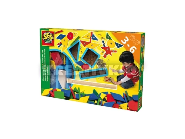 A SES kalapács készlet segítségével az örökké barkácsolni vágyó kisfiúk, most kedvükre kalapálhatnak. A játék végeredménye pedig olyan kép lehet, melynek csak a fantázia szab határokat. A készlet egy parafa táblát, egy fakalapácsot, egy csomag szöget, valamint egy csomag mértani formákat tartalmaz.