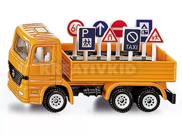 1:87 méretarányú Scania teherautó közúti jelzőtáblákkal a Sikutól. A járgány fém és műanyag felhasználásával készült, a betonkeverő tartálya forgatható.