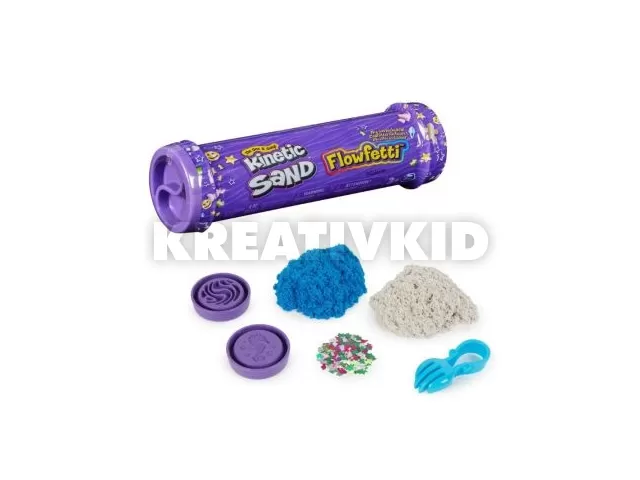 Kinetic Sand: Flowfetti meglepetés henger alkotni vágyó gyerekeknek. A homok könnyen összetapad, nem szárad ki, a dobozban pedig praktikusan tárolható. Az, hogy milyen színű homok és mely eszközök rejlenek a dobozban, meglepetés.