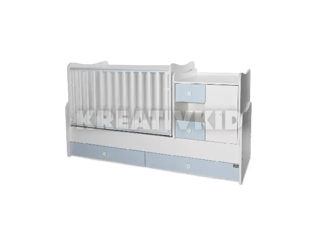 - A kombi ágy egyszerre babaágy és pelenkázó komód, nincs szükség két külön bútordarabra. Amikor a gyereknek már nincs szüksége rácsos kiságyra, a komód és a rácsok levételével egyszerűen átalakítható ifjúsági ágy keretté és éjjeliszekrénnyé.
