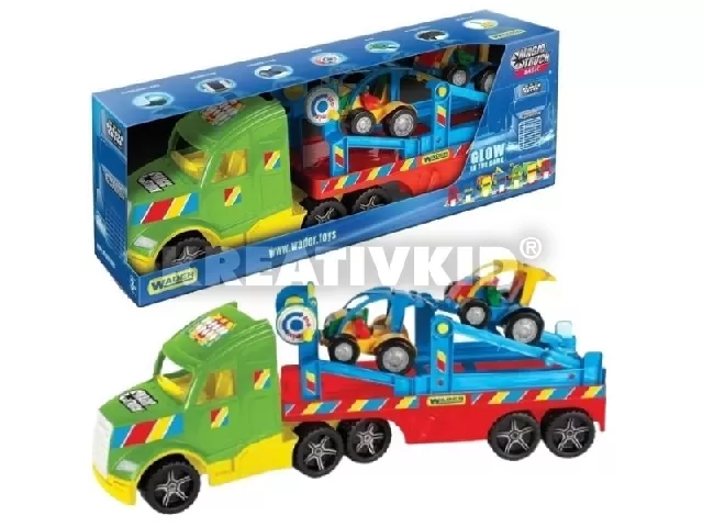 A MagicTruck Basic kamion lámpái fluoreszkálnak a sötétben. Levehető, torziós félpótkocsival rendelkezik. A félpótkocsi kétféleképpen rögzíthető a fülkéhez, aminek köszönhetően az autó 110 cm hosszú lehet. A csomagban 2 db buggy autó is található. Méret: 79 × 19,5 x 28 cm