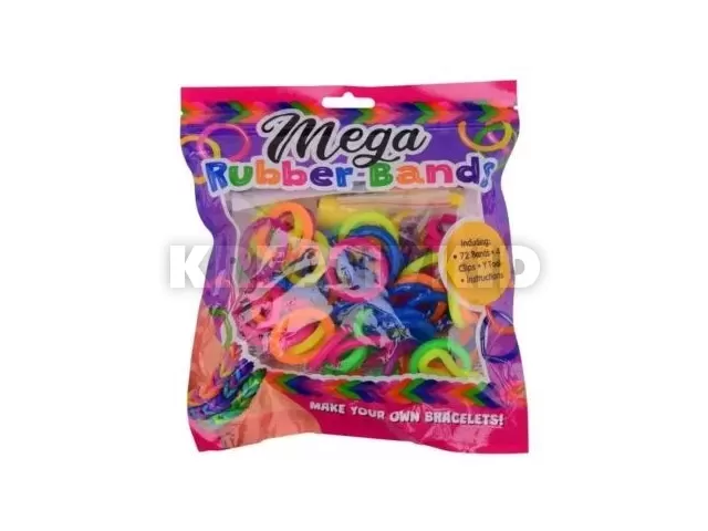 Karkötő készítő készlet sokszínű, nagyméretű gumikkal és csúzli formájú segédeszközzel. Tartalma: 72 db gumikarika, 4 db kapocs, 1 db formázóeszköz, használati útmutató.