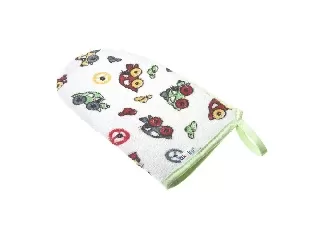 Gyermek frottír mosdókesztyû Akuku vidám képekkel fiúknak. Praktikus füllel felakasztható. Mérete: kb 21x12 cm. Anyaga:82% pamut, 18% poliészter.