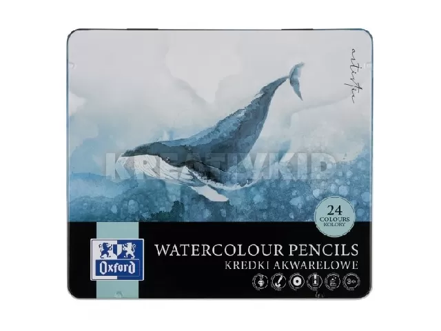 Oxford Art akvarell-színesceruza 24 ragyogó színben, 3 mm-es bélvastagsággal, lakkozott fatesttel, ecsettel, fémdobozban. A gazdag és élénk pigmentek, valamint a professzionálisan kiegyensúlyozott árnyalatok vízben oldva könnyen keverednek, így tökéletes árnyalatátmenetek hozhatók létre. Szárazon és vízzel keverve egyaránt használható.