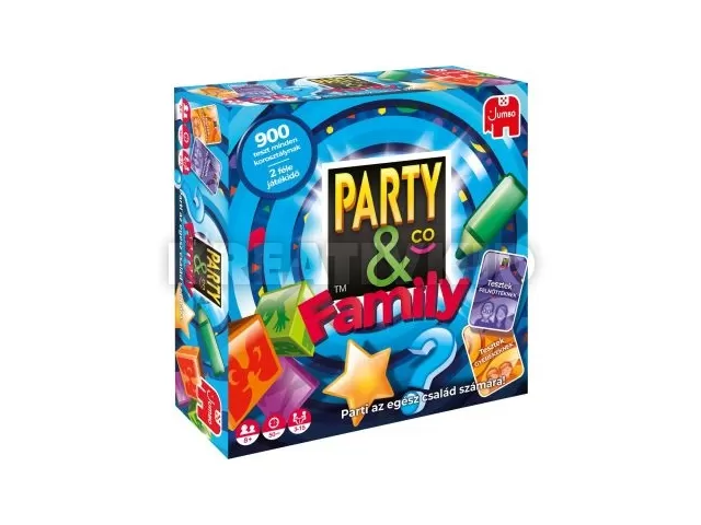 Jumbo: Party & Co Family társasjáték 900 kérdéssel és feladvánnyal. A feladattípusok között kérdések, rajzolás, mutogatás, valamint különleges akciófeladatokat rejtő partikockás kihívások szerepelnek.
