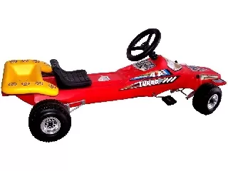 A piros pedálos gokart egy fém vázzal, műanyag üléssel és kormánnyal, műanyag kerekekkel felszerelt stabil négykerekű járgány. A gokart láncos ...