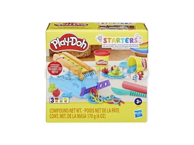Play-Doh: Gyurmaformázó kezdőkészlet, amelyben 1 db gyurmanyomó eszköz, 3 tégely Play-Doh gyurma, 2 db gyurmaformázó kiegészítő, 1 db műanyag kés és 1 db nyújtóhenger található.