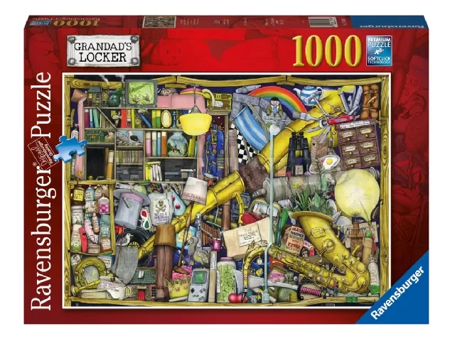 A Ravensburger 1000 db-os puzzle - Grandad's Locker című képen Colin Thompson alkotásában mindenféle izgalmas holmit és kacatot, a nagypapa zárható szekrényének rejtett tartalmát részletező illusztrációt láthatunk.