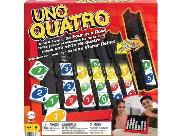 Mi történik, ha két egyszerű és nagyszerű játékot ötvözünk? Hát létrejön az UNO QUATRO! A társasjáték a klasszikus "4 a nyerő" szabályait ötvözi az UNO világával. Csomagolás mérete: 27 x 27 x 5 cm