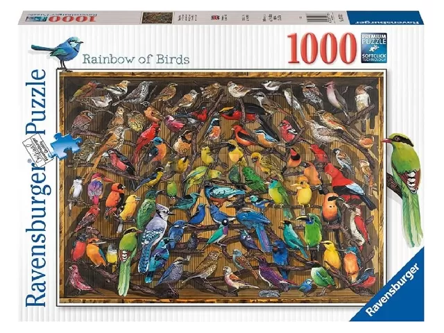 A Ravensburger 1000 db-os - Rainbow of Birds című képen a világ különböző tájain előforduló színpompás madarak szivárványt idéző csoportképe látható. A kirakott puzzle képen megtalálható a nálunk is honos verébtől az Amazonas zöld papagáján keresztül az Észak-Amerikában élő Vörös Kardinálispintyig számtalan, kisebb-nagyobb tollas szépség.