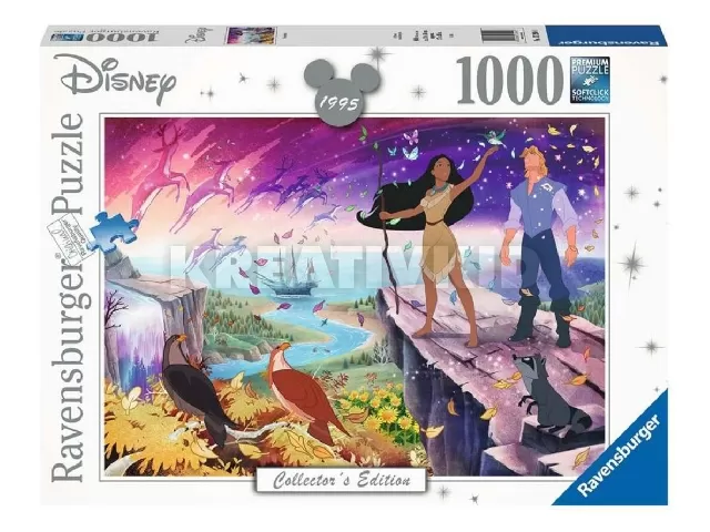 A Ravensburger 1000 db-os puzzle - Disney Collector',s Edition - Pocahontas képén a híres indiánlány és szerelme láthatók. A rajzfilm 1995-ben jelent meg.