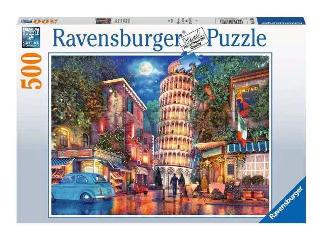 A Ravensburger 500 db-os puzzle - Pisa utcáin képén az utazók körében is népszerű olasz város egy hangulatos utcajelenete elevenedik meg, háttérben a leghíresebb látnivalójával, a Világörökségi listán is szereplő műemlékkel, a Pisai ferdetorony épületével.