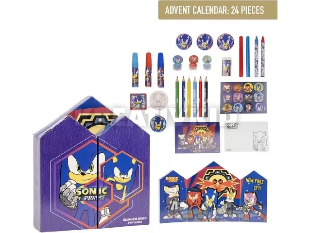 Sonic Prime adventi kalendárium gyerekeknek. A csomagban mini ceruzák, filctollak, radír, nyomdák és még sok más található.