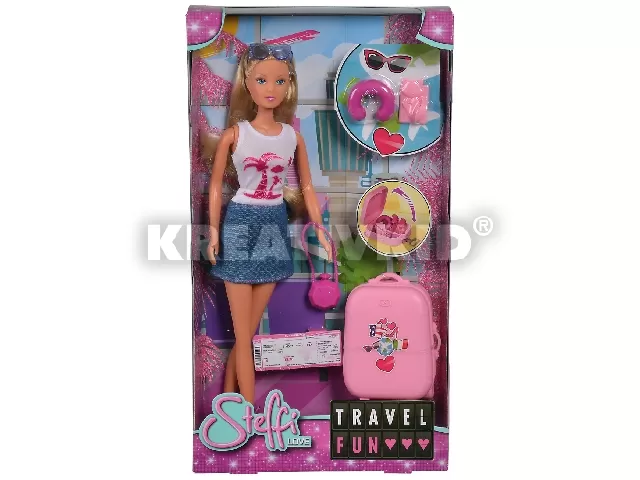 Járd be a fél világot Steffi Love babával! A Steffi Love utazó baba egy könnyű ruhába öltözött szőke játékbaba, aki imád minden módon utazni, kirándulni. A baba napszemüveget hord, a karjai és lábai mozgathatók, a készletben egy gurulós bőröndöt is megtalálsz, amiben minden fontos dolgot, ruhákat is magával tud vinni. A Steffi Love utazó baba mérete: 29 cm.