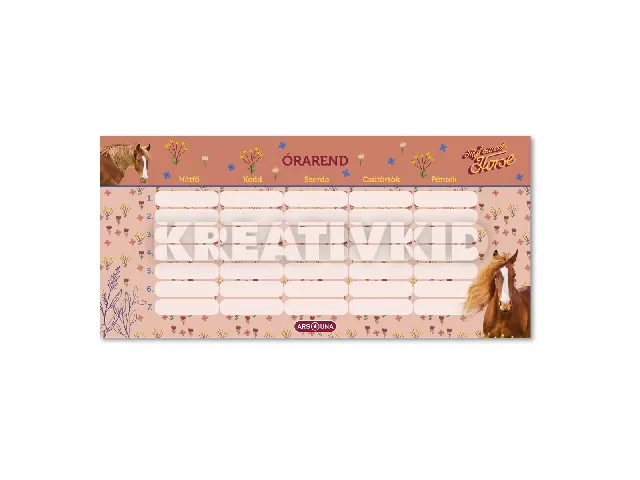 Kétoldalas, magyar nyelvű órarend A és B hét beosztással. 250 gr-os félfényes műnyomó papírra, 4 szín nyomással nyomott.