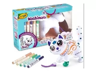 A Crayola Washimals: Mozgatható óriás kiskedvenc egy óriás méretű kutyus figura, 5 db kimosható filctoll és egy kefe található. A figura feje és lábai...