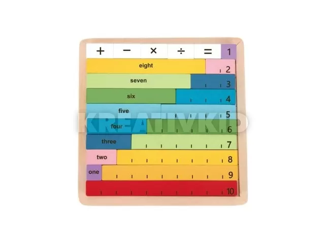 Tooky Toy: Számolni tanulok! fa játékszett különböző színű és hosszúságú színes rudakkal, valamint műveleti jeleket ábrázoló kockákkal. A játék minőségi fából készült, az elemek az alaplapon tárolhatók.