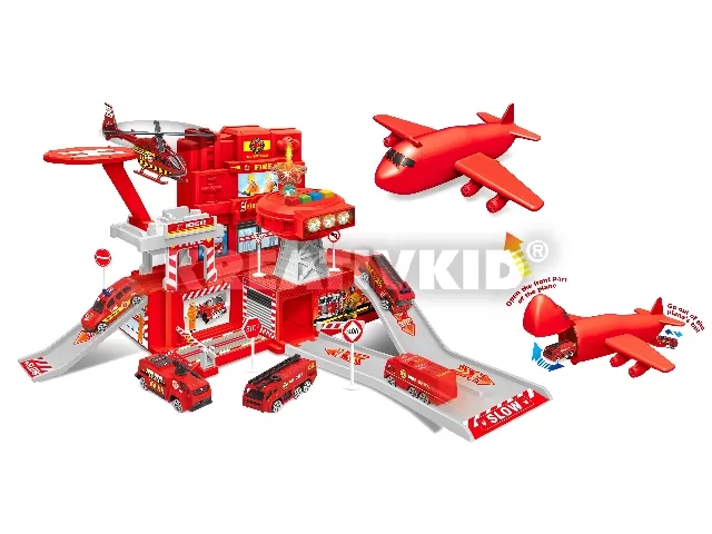 Tűzoltóállomás zenélő, világító világítótoronnyal, 1 repülővel, 2 fém autóval és műanyag autókkal