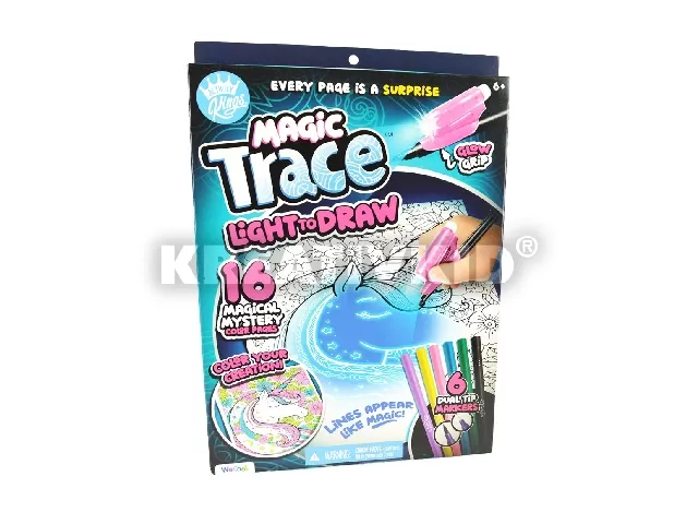 Miben más a Magic Trace, mint a többi rajzoló, színező játék? A benne lévő varázslattól. Egyszerre ötvözi a rajzolás és színezés örömét a meglepetés, felfedezés izgalmával. Első pillanatra úgy tűnik, mintha egyszerű, fehér lapokat rejtene a csomagolás, de amikor felkapcsoljuk az uv lámpát, a képek életre kelnek. A feladat innentől már egyszerű: először rajzoljuk át a világítás hatására megjelenő vonalakat, majd színezzük ki a kapott képeket kedvünk szerint.