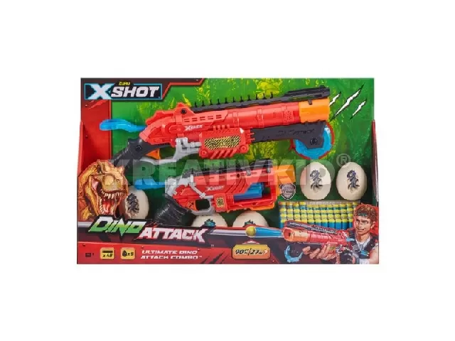 Itt az új X-Shot Dino Attack sorozat! Készülj fel a Dino invázióra az Ultimate Dino Attack Combo Pack csomaggal, amely tartalmazza a Dino Striker fegyvert, automatikusan forgó csővel és a puska stílusú Claw Hunter fegyvert. Az X-Shot játékfegyverek extrém lövőerővel és hajszálpontos lövésekkel tökéletes eszközök a szabadtéri harci játékokhoz. Akár 27 méteres lövőtávolságra is képesek.