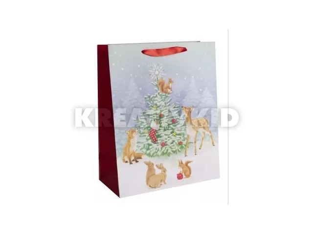 Ajándéktasak karácsonyfa és erdei állatok mintával - 18 x 23 cm