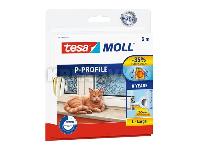 Ajtó- és ablaktömítő szalag, 9 mm x 6 m, TESA "tesamoll® P profil", fehér