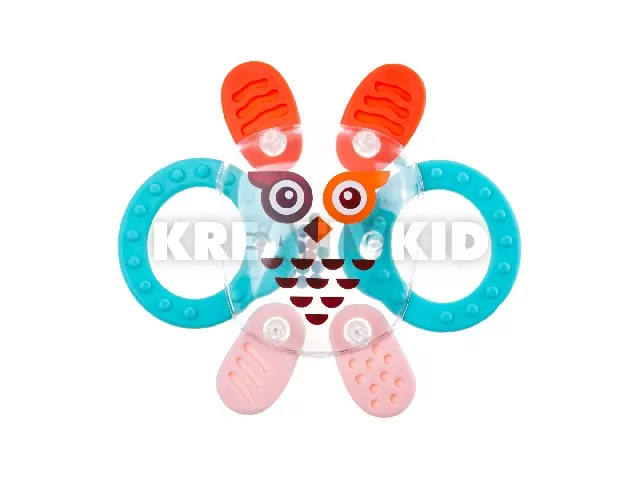 Színes csörgõ rágóka. Kellemesen gömbölyített formavilág, melynek köszönhetõen könnyedén foghatja kezében és rágcsálhatja a baba.