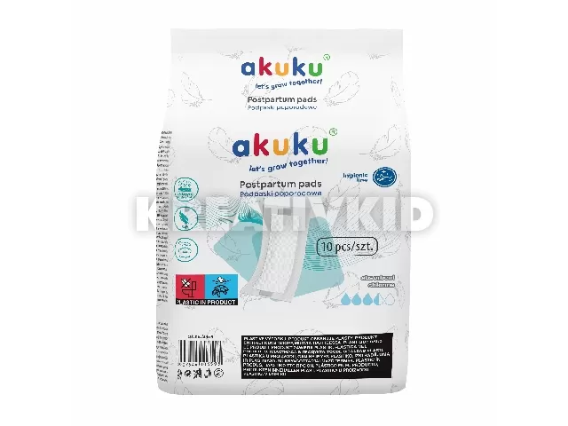 Az 'akuku' nedvszívó szülés utáni betétek a szülés utáni idõszakban biztosítanak minden helyzetben kényelmet és nyugalmat. A finom és szuper puha belsõ réteg megakadályozza a leragadást és a bõrirritációt. A felsõ réteg lehetõvé teszi a levegõ áramlását, ezzel biztosítva a frissesség érzését. A párna belsejében található szuperabszorbens pedig gyorsan megköti a nedvességet és semlegesíti a kellemetlen szagokat. A széles ragasztócsík a helyén tartja a betétet.
