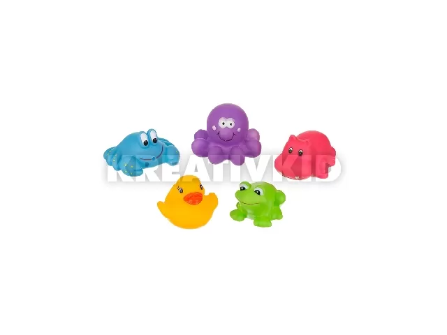 A csomagban 5 db aranyos kis színes állatka, vagyis kacsa, rák, rák, víziló, béka és polip található.