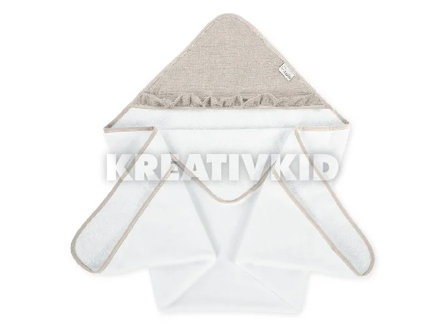 • A termék egyedi jellemzője a puha pamut muszlinból készült kapucni, amelyet bájos fodrok díszítenek. Ezáltal a fürdőlepedő nemcsak praktikus, hanem stílusos kiegészítő is.