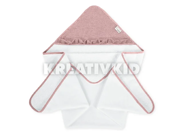 • A termék egyedi jellemzője a puha pamut muszlinból készült kapucni, amelyet bájos fodrok díszítenek. Ezáltal a fürdőlepedő nemcsak praktikus, hanem stílusos kiegészítő is.