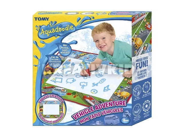 A Tomy Aquadoodle szőnyegen, vízzel megtöltött speciális tollal rajzolhatnak és írhatnak a kicsik. A víz hatására, a lap színe megváltozik.