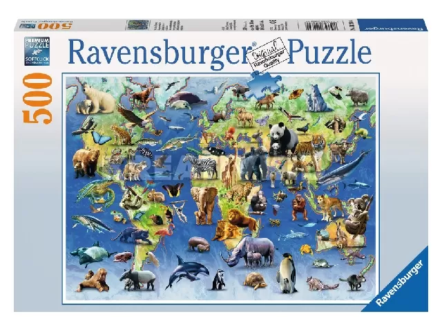 500 db-os Ravensburger puzzle a földrészek és a rajtuk honos állatok képeivel.