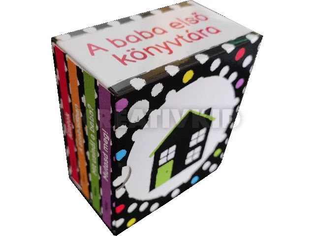 A baba első könyvtára: négy kis könyv egy dobozban. Mindegyik könyv kontrasztos fekete-fehér illusztrációkat tartalmaz, amelyek elősegítik a babák figyelmének összpontosítását. A vastag kartonlapos könyvek alkalmasak a közös lapozgatásra, de élükre állítva a babák egyedül is tudják nézegetni őket. Ideális ajándék lehet ez a kedves kis könyvtár a baba első könyveiből: Mit csinál a baba?, A szabadban, Állatok, Mutasd meg!